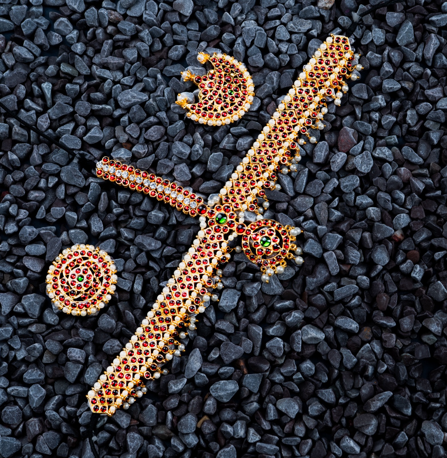 This exquisite Bharatanatyam Temple Jewellery Set is a masterpiece of South Indian craftsmanship, designed especially for classical dancers and cultural performances. Made with vibrant Kemp stones in red and green hues, set against a gold-tone base and adorned with delicate pearls, it radiates divine elegance. The set includes essential dance ornaments that enhance the grace and expression of Bharatanatyam performances, making it perfect for both stage and ceremonial use.