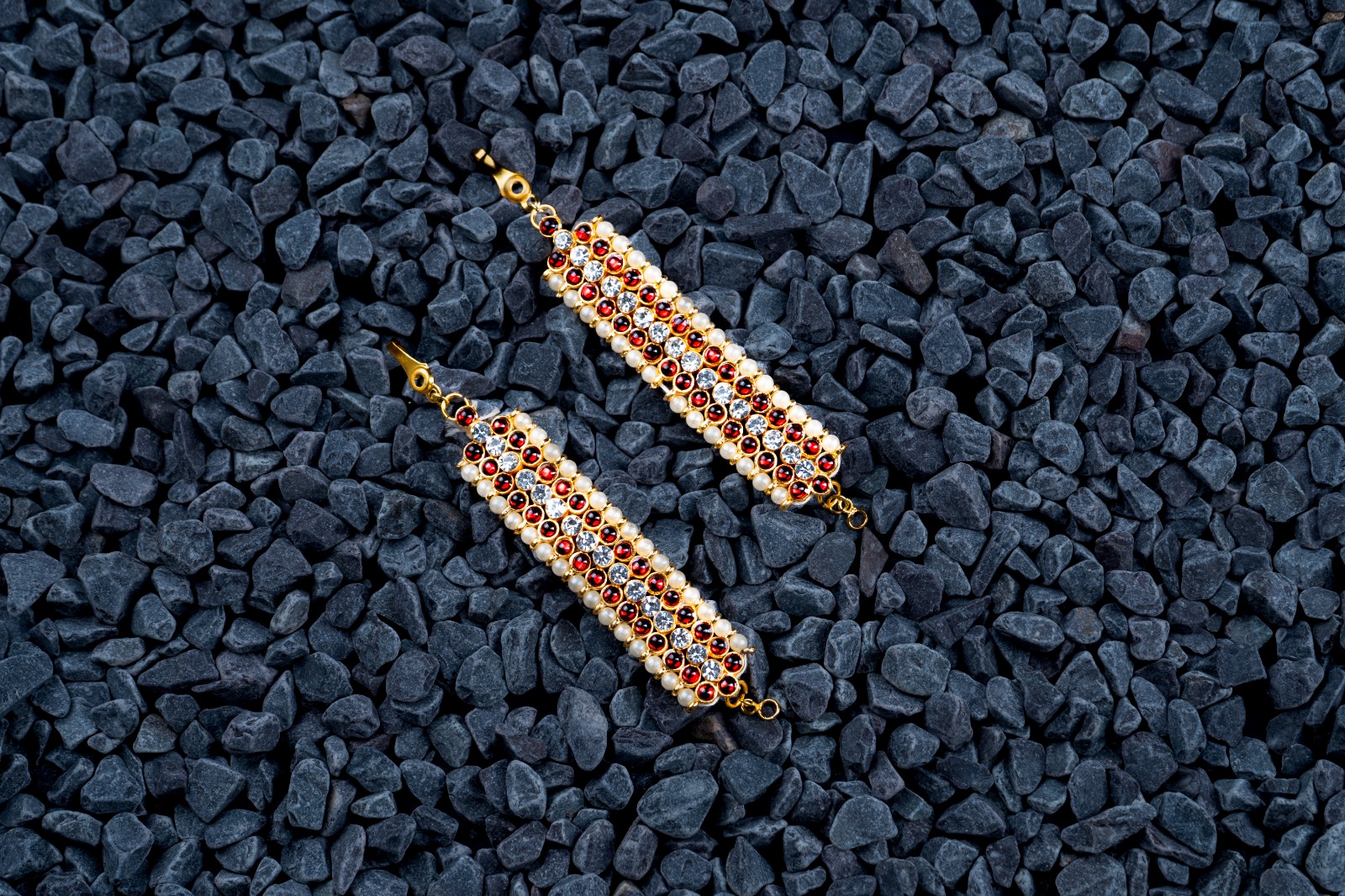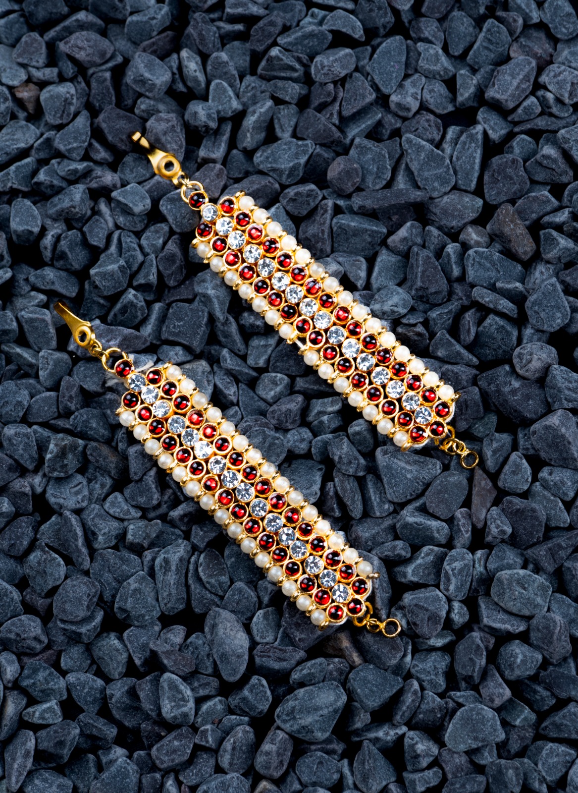 Add a touch of royal elegance to your ethnic look with these stunning Ruby Pearl Line Chandbali Earrings. Featuring a graceful combination of red ruby stones, shimmering white pearls, and sparkling crystals set in a gold-toned base, these earrings beautifully capture the essence of traditional Indian craftsmanship. Ideal for weddings, Bharatanatyam performances, and festive celebrations, these long statement earrings complement sarees and lehengas with timeless charm.